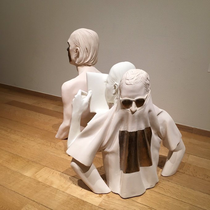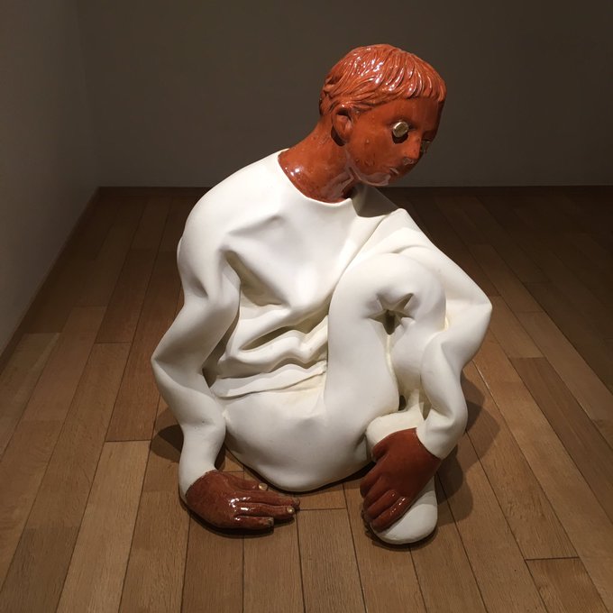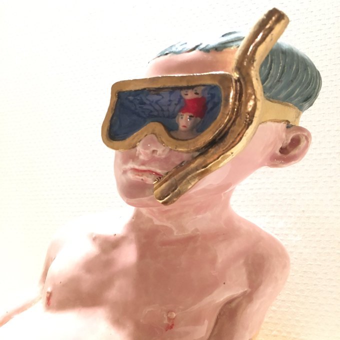 額賀さん@nananonano7の展示に滑り込みで行きました〜。メガネシリーズめっちゃ好きなのですがこのゴーグルにプールの中の赤帽BOYうつってるの、特に好きでした。お皿に載った首像や、ブレてるようなレリーフも…(写真が…ない!?