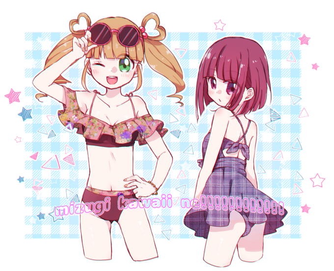 水着ガチャ祈願!!!!と思って描こうと思ったけど水着のデザインがまだわからなかったのでとりあえず着せたい水着を陽彩ちゃんと依子ちゃんに着せました!!!!! #マジカミ #マジ神絵