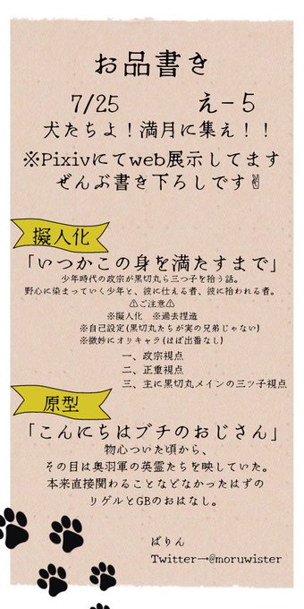 7/25 0:00〜のピクスク #銀牙webオンリー え5「メレンゲ兄弟」にて黒脛巾組の小説(擬人化)と、リゲルの短編(原型)をPixiv展示します! 会場はとにかく銀牙ワールドになっててすごい! 皆のもの〜!!! #満月に集え