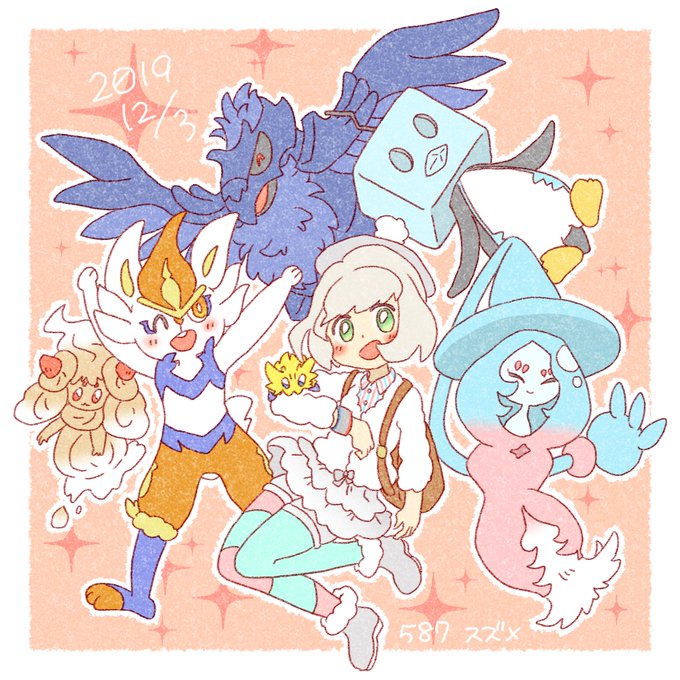 クリア記念絵🙌🙌 エースバーン♂こんそめ アーマーガア♂じょん バチュル♂はうちゃん マホイップ♀かろりー ブリムオン♀よぞら コオリッポ♀えたの〜る #ポケモン剣盾