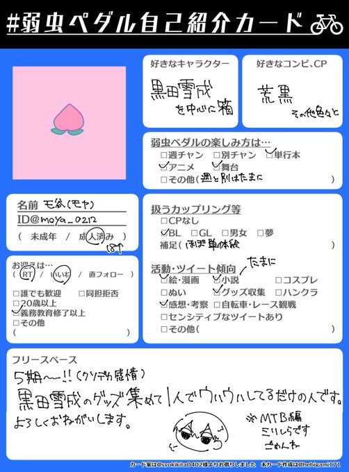 #弱虫ペダル自己紹介カード #弱ペダ好きさんと繋がりたい #弱ペダクラスタさんと繋がりたい 5期始まる前に〜❕黒田雪成に狂わされて数年の女です❕ ♡、🔄で気になった方お迎え行きます🙇♀️