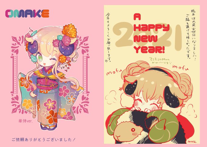 【AC】謹賀新年ミニセットのご依頼ありがとうございました🥰お任せ頂けたのでカラーは個人的にこういうのも似合そうと思った明るい華やかなお色で纏めました😊おまけはもふもふ年賀です🐮🐏