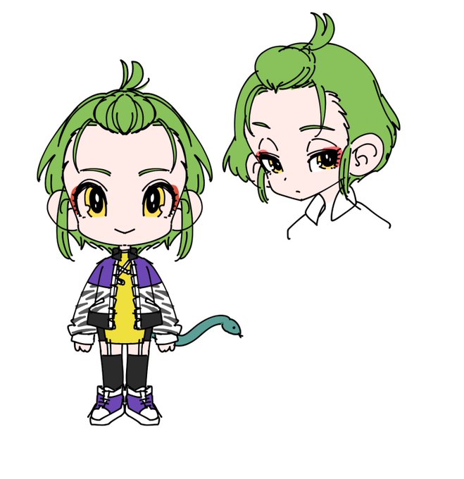 ヌエちゃん、第一段階(左)と第二段階(右)。 元気すぎるのは私の性癖ではないので、つり目っぽいのからアンニュイ目に。 髪型もショートボブっぽく変更。 ヌエの狸要素がないので、信楽たぬき要素でも入れようか。