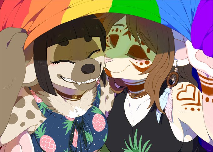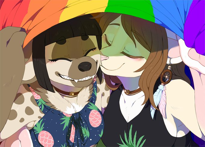 A gift for my beloved mate @shiroganeryo, to celebrate yesterday's "Dia dos Namorados", our fursona showing their #pride ! Happy in being lesbian with you haha love you, my dear~ ❤️ 💛 💚 💙 💜