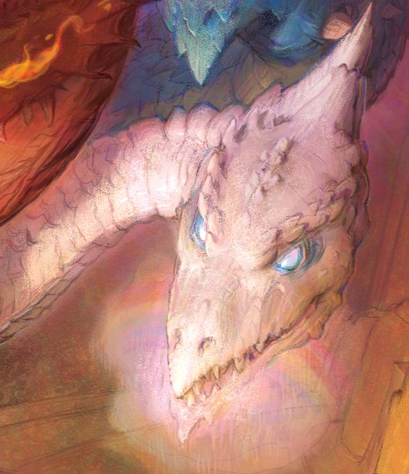 My favorite part of this painting is the white head. I imagined a frost dragon might have a constant fog around her head, and in the right lighting you'd get a rainbow.