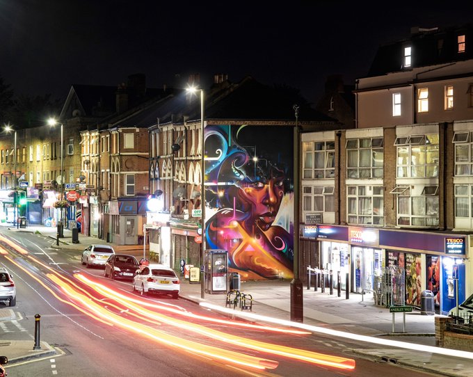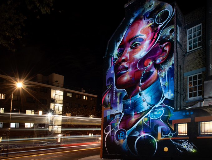 some night shots of my latest mural in Peckham, South London using some special lighting @princepeckham ⚡️⚡️ Made possible by @globalstreetart and @molotowheadquarters ⚡️⚡️amazing shots as always from @streetartatlas and big thanks to @willpowerphotos for the reference image