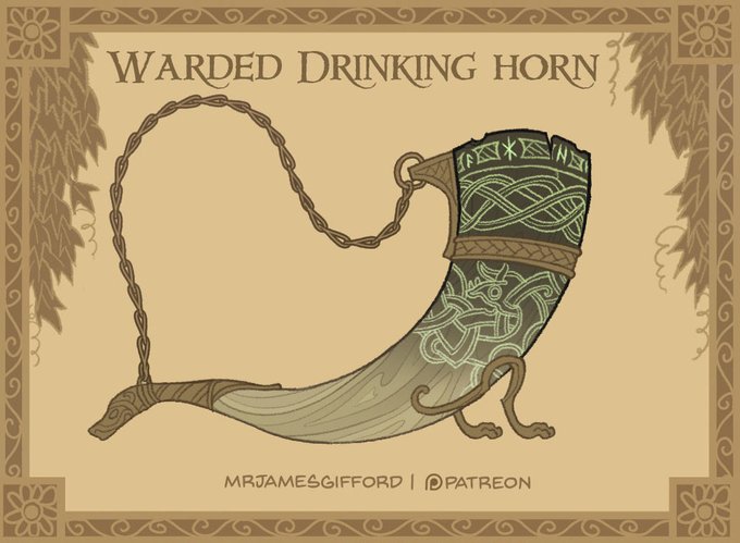 Many wary kings and queens keep this drinking horn close. Though they come in a variety of styles and shapes, a ring of protective runes are always etched around the mouth of the vessel. 🍷☠️💥