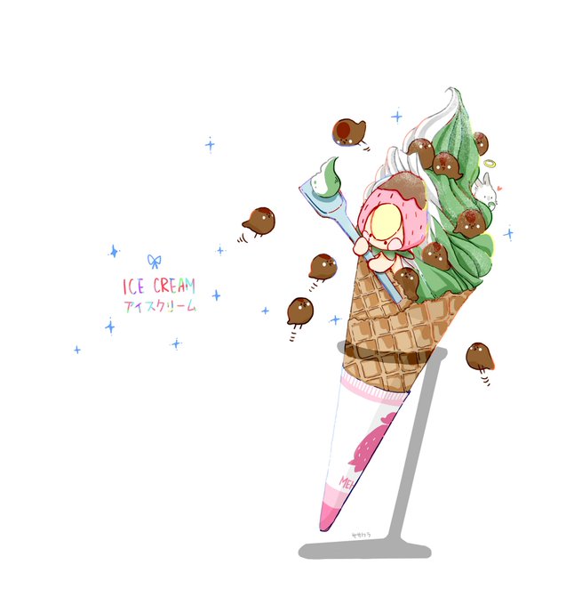 抹茶アイスクリーム 冷たい〜 Green tea ice cream (๑´ڡ`๑) #イラスト #絵 #絵描き #らくがき #アイスクリーム #抹茶 #冷たい #スイーツ #甘い #いちご #うさぎ #スズメ #かわいい #癒される #おしゃれ #メーとスズメの友達