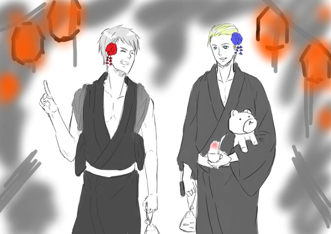 【@tatsukiti 】ネタくれたので描いてみましたー落書きです! 背景なんて描けません(´_ゝ`)髪飾りは兄さんにつけられました。くまは射的で兄さんにとってもらいました(*'ω'*)