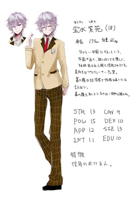 宝水紫苑 人当たりのいい顔した優男してるけど裏では狂信者してる。信仰してるのはキツネとか玉藻の前とか考えてるけど決めてない 身内に対しては穏和な態度とるけど他人には冷たい。塩対応。口もちょっと悪い