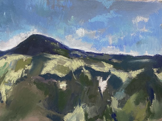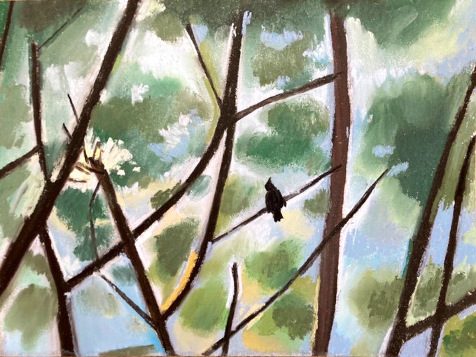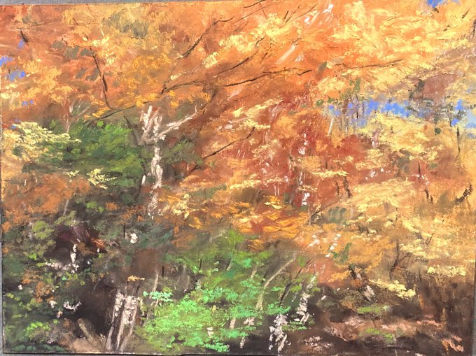 今日描いたパステル画。 夏の森林描きすぎて緑系、一気に減っちゃったから今日は去年の紅葉描いてみたけど、めっちゃいい感じのが描けた気がする! 昨日書いたのも含めて、新しいタッチがけっこう好きだなぁ