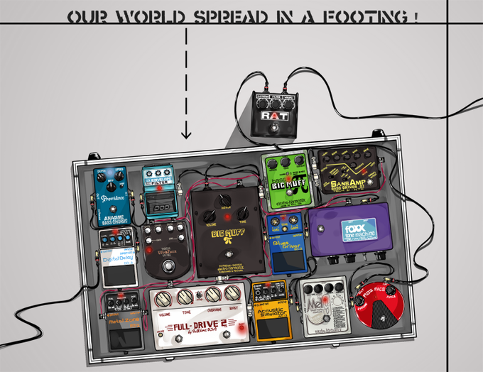 ティアのエフェクター擬人化本、裏表紙にて描くペダルをボードに組んでます。BASS系やプリアン空間系と結構カオスなボードだけどペダルと言えば!!のNotaさんに相談させてもらって色々頑張りました~