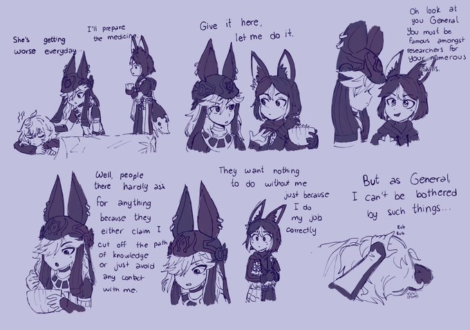 a cute idea i had! My hc is that Cyno knows how to knit and to earn Collei's trust, he makes her a cat poncho of her bomb