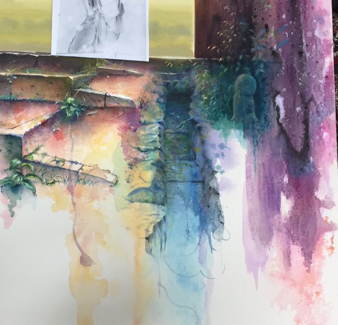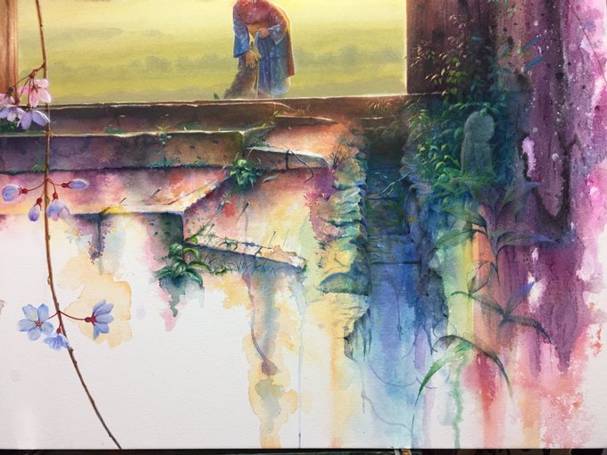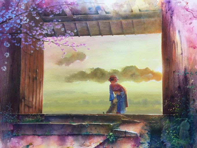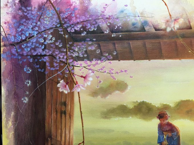 [ルーブルへ向けて] やっとここまで描けた! まだこれから 舞妓さんにもっと逆光感を出す為に 上から色を流すけど、 もう少し! 10月半ばには出発なので あと2週間しかない とにかく時間が足りなーい! 優しい桜吹雪の中の雰囲気を早く 描きたい! #アクリル絵の具 #水彩絵の具 #舞妓さん