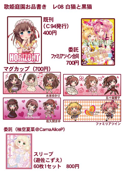 夜告知。明日の歌姫のお品書きです。スペースは入口目の前、まゆのポスターが目印です。ポスターは撤収時に希望の方に差し上げます(1名様)。よろしくお願いします。