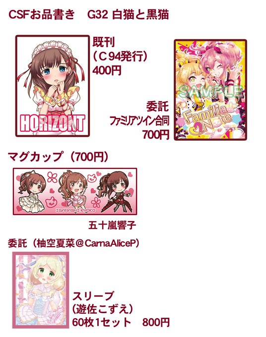今週土曜のCSFのお品書きです。今回は水本ゆかり(エアリアルメロディア)をリニューアル、城ケ崎姉妹をGWぶりに再生産しました。よろしくお願いします。