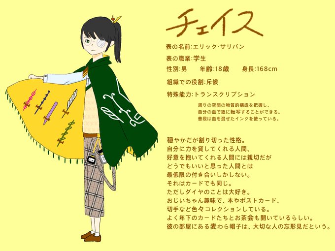 カード化リプとアンケートありがとうございましたー!! チェイスくんです! 要素拾いきったはずだ…!マイアーさんの白スカーフは見えてない左手首のスートマークの位置にしてます(見えてない) #カード化したみなさんの紹介図鑑
