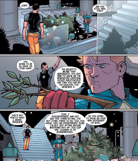 それぞれにクリスマス休暇の予定があってわ〜っと歩き出す中キャップだけが佇んだまま「さて、クリスマスツリー片付けよう」て呟くのを背中で聞いたトニーが、不器用に様子見に来るの可愛い…ほんとに一人で平気なの?平気さって感じの会話がまた…