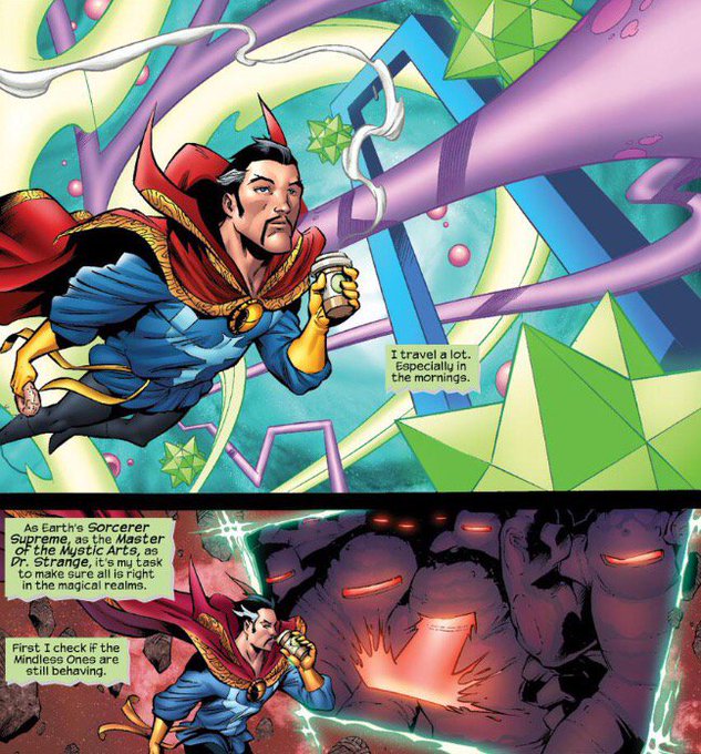 ソーサラースプリームの朝は早い。「まず魔界の見回りから私の1日は始まるんだよ。聞き分けのない子たちの様子を確認したり、とても大変だけど、やり甲斐のある仕事さ」ドーナツとコーヒーを持ったストレンジの表情はぶっちゃけ余裕そうだった