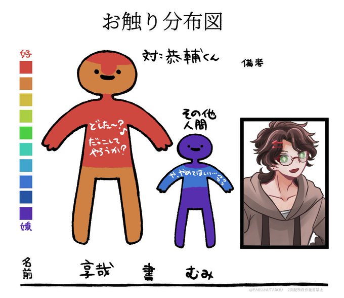 これはうちの奴らのお触り分布図(ざっくり) うちよそ相手とその他の人間で露骨に違ったりなどする。いっぱいあるぞ‼️‼️‼️‼️その1