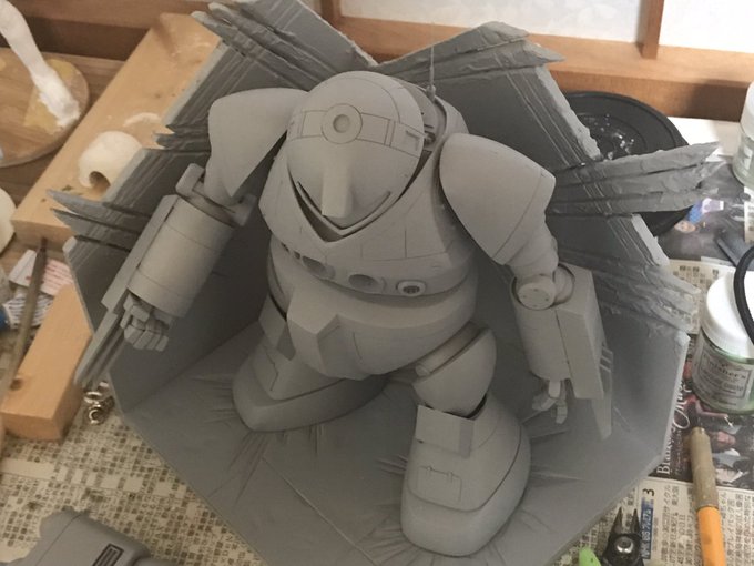 イエサブさんの1/100ガンプラコン用の旧キットゴッグ無理やりサフふいた 本当はベースも完成してから、雰囲気見るための色も塗りたかったけど、珍しく改造しているので、スジボリやプラ板工作跡が少しガタガタ ハルクバスターとウルバリンを足して2で割ったイメージ #イエサブ #ガンプラコンテスト