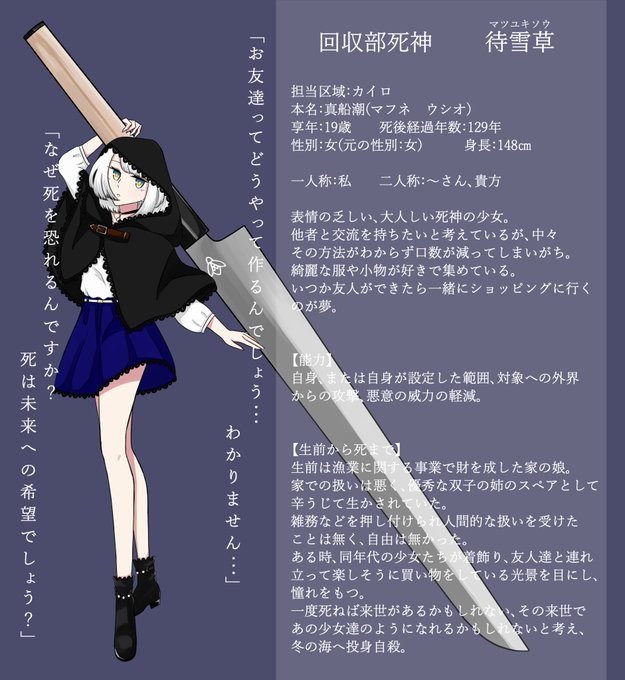 こちらの企画【@MEIFU_info 】に参加させていただきます。 大人しい性格の死神の少女です。 事前にバディ関係のみ頂いております。 よろしくお願いいたします。 #死にがい_CS #死にがい_CS_回収部