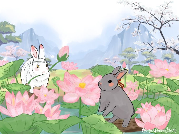Bunji sees Bunxian among the lotus flowers... Bunny courtship begins!🌺🐇