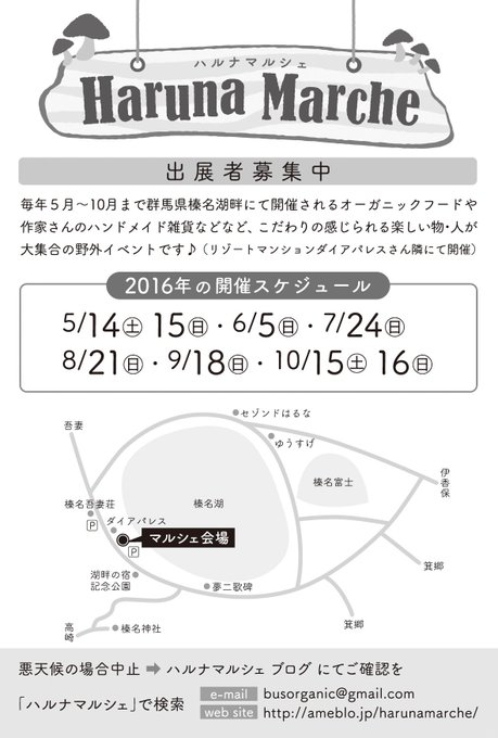 群馬県高崎市の榛名湖畔で5〜10月に開催される人気イベント「ハルナマルシェ」のフライヤーデザインを今年も担当させていただきました!裏面で今年度の日程と会場までのマップをお知らせしています。