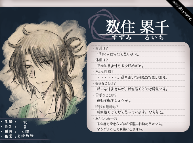 @kikyo_wall #暗夜迷宮キャラクターシート お借りしました。暫定こんな感じ? るいち(メインPC)の立ち絵もがんばります( ˘ω˘)。メインPC、うちよそあわせありサブPC、半NPC予定、半NPCにするつもりだったんです(やりたいに屈してPCにするかも)な鬼さんです。 https://t.co/0ktDIjBFBf