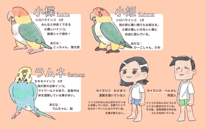 🐥かどまつ家 メンバー紹介🐥 愉快なインコ3羽と愉快なカイヌシ2人で、毎日面白おかしく暮らしてます! #シロハラインコ #シロハラ日記 #セキセイインコ