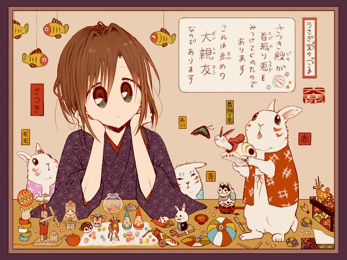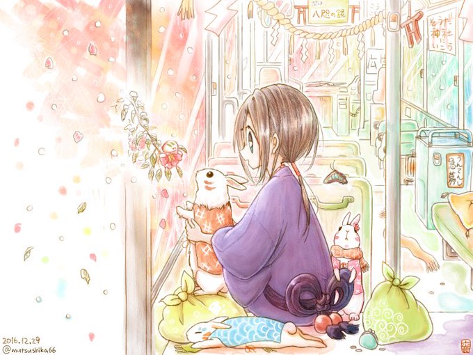 同じめんつの絵増えてきた ①かざりつけ(2016.11)🌸 ②さざんかうさぎ(2016.12)❄ ③うさぎ堂の一こま(2019.03)🐰 ④はつもうで(2020.02)⛩