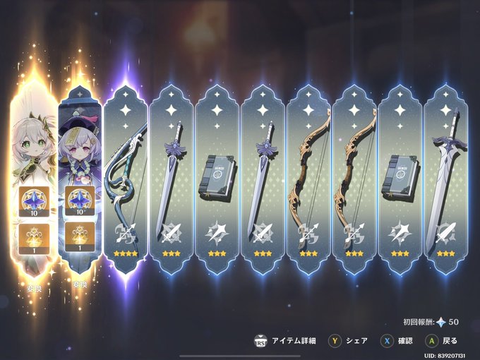 ナヒーダちゃんとモチ武器引いたよ! あとは何凸まで目指そうか