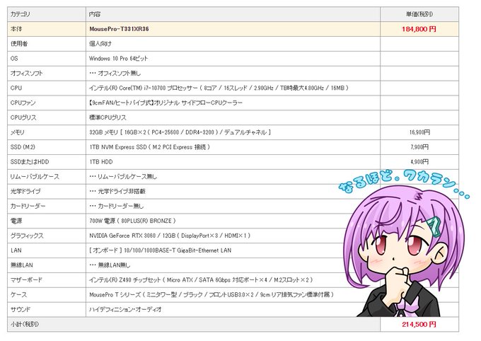 お世話になったマウスコンピューターのサイトで見積もってみましたので、比較等の参考にしてみて下さいませ🤲