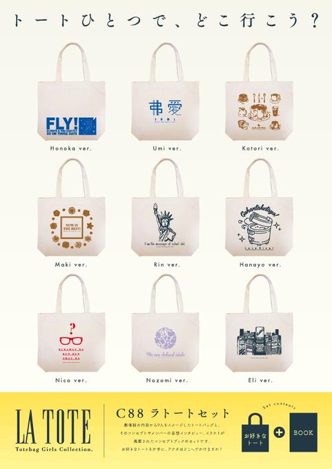 夏コミ新刊『ラトート』セット詳細です!簡単にいうと、トートと本のセットです〜。お好きなデザインのトートを選べます!トートは劇場版の内容をもとにデザインしています。詳しくは随時告知していきますので、よろしくお願いします〜