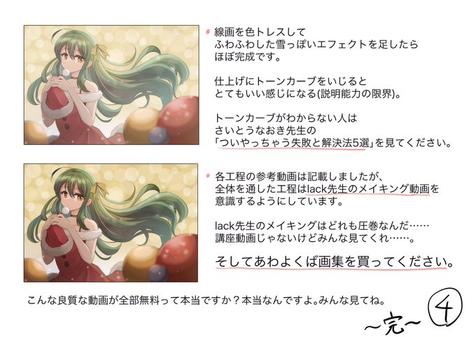 さいとうなおき先生、ディープブリザード魔王様、焼まゆる先生、lack先生の動画を参考に最近はこんな描き方をしています。まだ修行中ですがかなり描きたい絵が描きやすくなった気がする……!( ˘ω˘ )