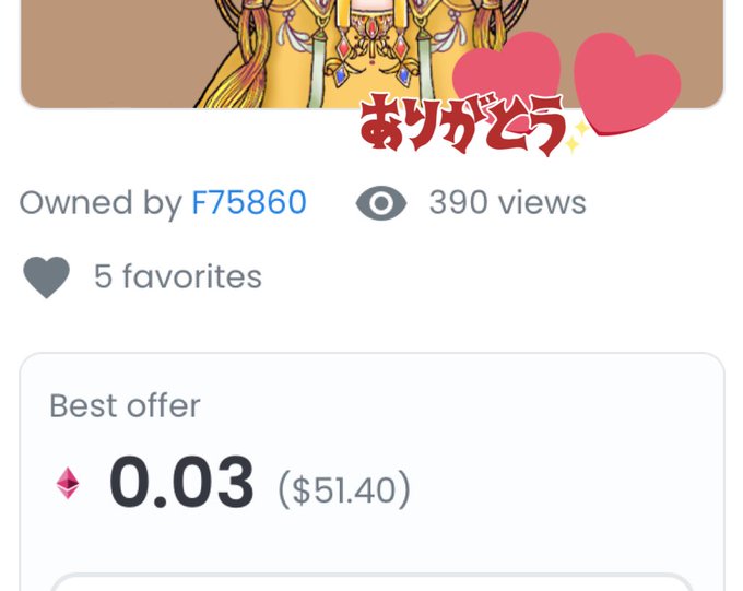 Twitterがどなたか分からないのですが、0.028ETHでオファー入れてくださった方がいらっしゃいました😳ありがとうございます💕