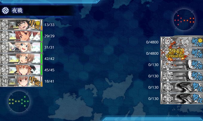 E5-4甲のクリア編成。本来であればJervisとJanusに対潜させないで魚雷を3本積んだ方がいいと思う。何回か試してうまくいかなければ山汐丸に洋上補給を積んで試してみる予定だった。基地航空隊は手数を少しでも増やすために喪失喪失劣勢劣勢。