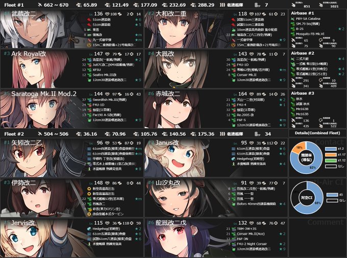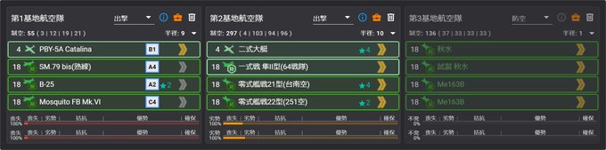 E6-4甲のクリア編成。基地航空隊は#1をYマス(一部隊で38%くらい航空優勢になる)に飛ばしてボス戦での手数を増やすために#2と#3をボスマスに飛ばした。梅雨イベントの最終海域に比べたらボスはマイルドな編成だしアフリカ大発と特殊砲撃があれば大体何とかなる。