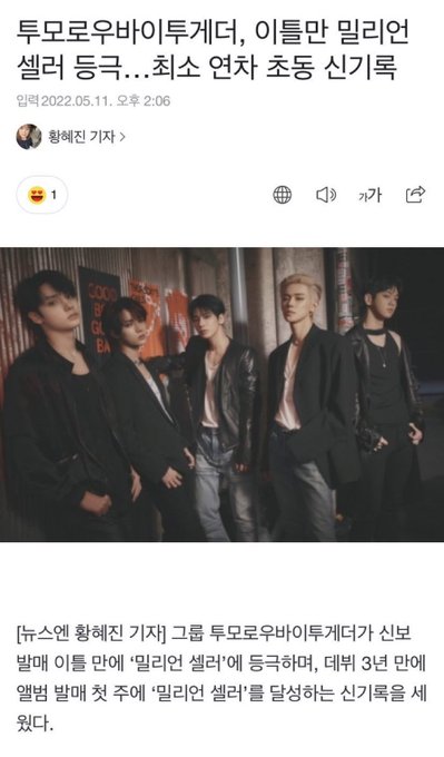 “ TXT ได้ million seller ครั้งแรกในสามปีหลังจากพวกเขาเดบิวท์ เป็นครั้งแรกในประวัติศาสตร์ที่วงซึ่งมีอายุสามปีได้รับชื่อ million seller ทันทีหลังจากปล่อยอัลบั้มในสัปดาห์แรก “
