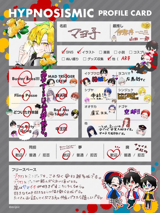 #ヒプマイ好きさんと繋がりたい #ヒプマイ絵描きさんと繋がりたい オフクロ🦉ジュク女🐺による気づけばちびキャラばかり描いてる雑多垢です✍🏻✨ RT中心に♥️も気になった方、無言フォローにてお迎えにいきます! 相互フォロー確認後、ご挨拶にも伺いますので、是非ともよろしくお願いいたします🙇♀️