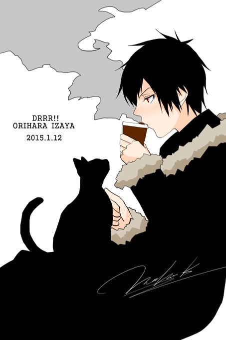テーマ「冬」ということであっついコーヒーふーふーしながら飲むノミ蟲\(^o^)////人ラブだからにゃんこにあんまり興味は無いけど、あったかいから好きなだけいれば?って感じだとかわいい。 #デュラララ版深夜の真剣お絵描き60分一本勝負