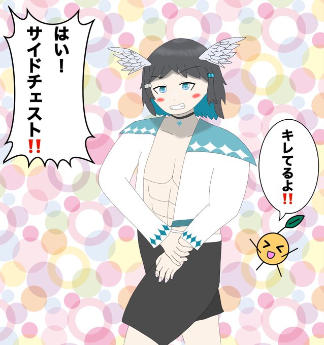 #りねアルバム #ファンアート お昼あげ。 2月6日分。 マッチョ!りねちゅん(男)と、その姿のりねちゅんの夢を見るみかんちゃん(まいくぼ)です。 サイドチェスト姿を描きたかった。 気づいたら男になってた。 胸筋を描いてる時には笑いを堪えるのに必死だった…笑 そんな作品です。