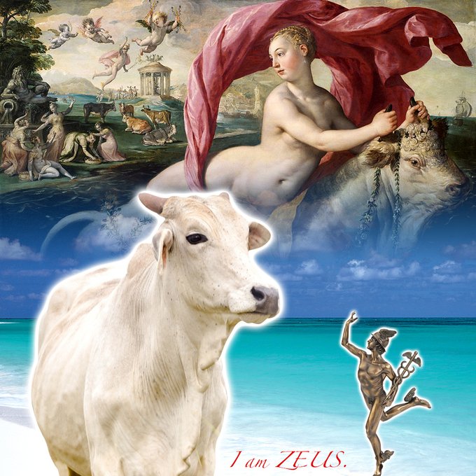 ゼウスはどう近づいたらよいか考えた後、伝令の神ヘルメースを呼びました。「山の牛たちを、浜辺のあの女たちの近くに追いやってくれ」。ヘルメースは、牛たちを追いはじめます。そして、ゼウスは白い牡牛に変身。