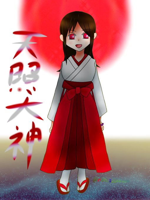 自分流に描いてみた天照大神です 友達にも太陽神はいるけどこちらの太陽神は日本の象徴ですね(小並感) よって擬人化です← #擬人化