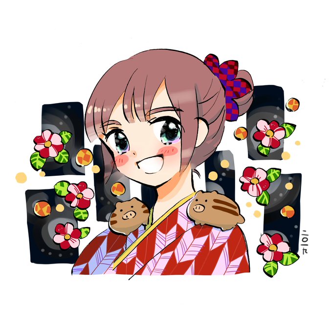 2019描き初め #女の子 #創作 #オリジナル #年賀状 #イノシシ #着物 #椿 #2019 https://t.co/WbjCjvguRQ