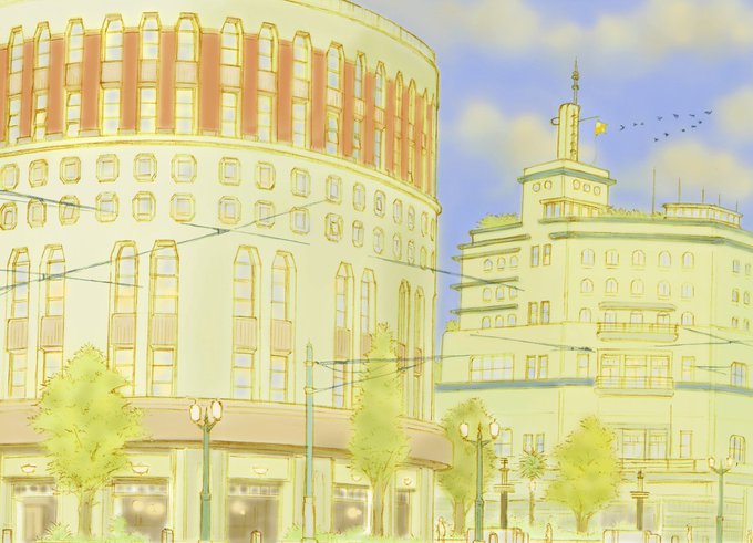 備忘録。城東中鉄探部(ボツ含む)背景画。架空の区「京橋区」銀座日本橋周辺。トラムが行く大通りの歩道は広く、中~低層の商店建築が居並ぶ。2~3区画離れた路地裏に行くと昔ながらの居住街区。これらを隔てるように大なり小なりの水路が通る。