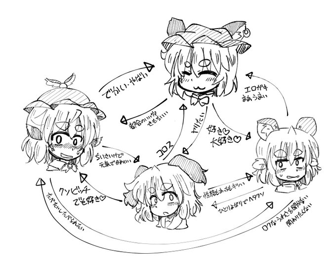 ぼくの描くみすちーと響子の関係が好きと言ってもらえてはちゃめちゃうれCので、いつぞやに描いた相関図を再掲 もっとこの子たちを描きたいですネ…