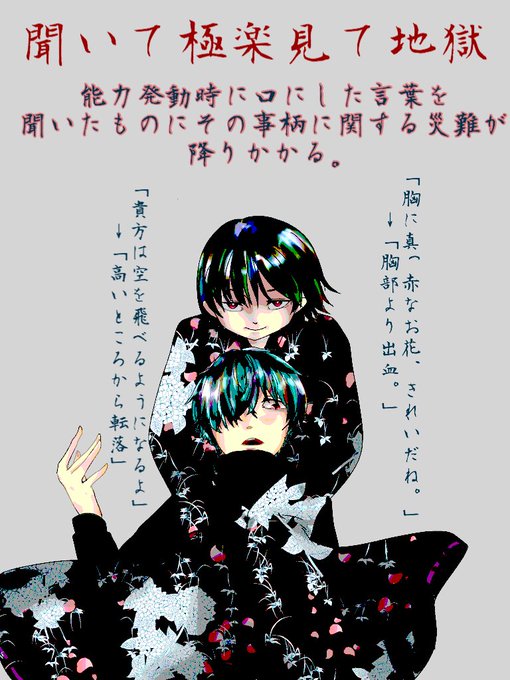【@_kotobataisen 】こちらの企画に聞いて極楽見て地獄、で参加させていただきます。和服のような服装をしているのが言技です。不備等ありましたらご指摘お願いします。 #言葉大戦_cs #言葉大戦_関係募集 #言葉大戦_参加者と繋がりたい