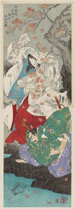 『信濃路紅葉鬼揃』の元ネタの能『紅葉狩』の戸隠山の鬼女退治の平維茂、江戸時代や明治の浮世絵によく描かれているけど、皆、ヒゲを生やした屈強な武者姿なのだな…(美公子というよりも)。鬼を退治する武将なのだから当たり前か。