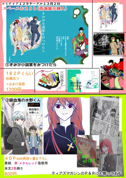 コミティアでは「きみが小説家をみつけたら」と再版した「吸血鬼の水野くん」、あと欲しい人には「部長が堕ちるマンガ」のコマをシールにした虚無ステッカー配ります。ティアズマガジンのP&Rにも載っているのでよろしく~ #コミティア129
